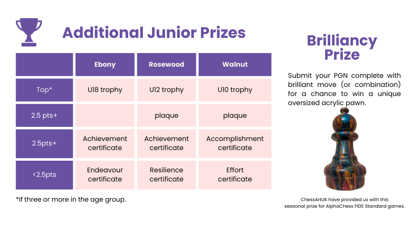 Players who enter this tournament agree to AlphaChess Swiss Event rules and Inclusivity, Byes, Prizes rules. Photos are taken at this event, please tell us if you want to opt-out!